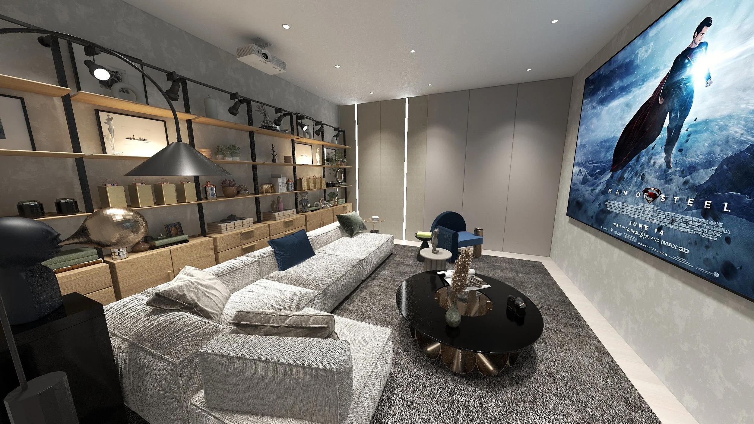 A sophisticated and subtly luxurious ambiance in the basement, featuring entertainment amenities.
